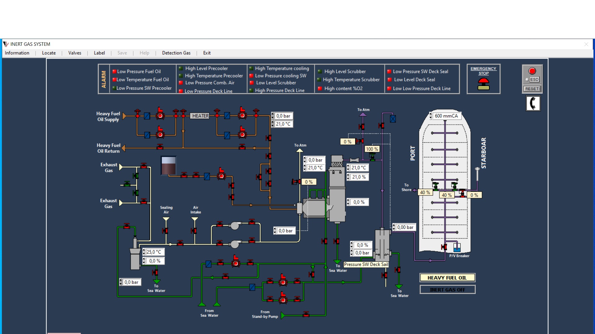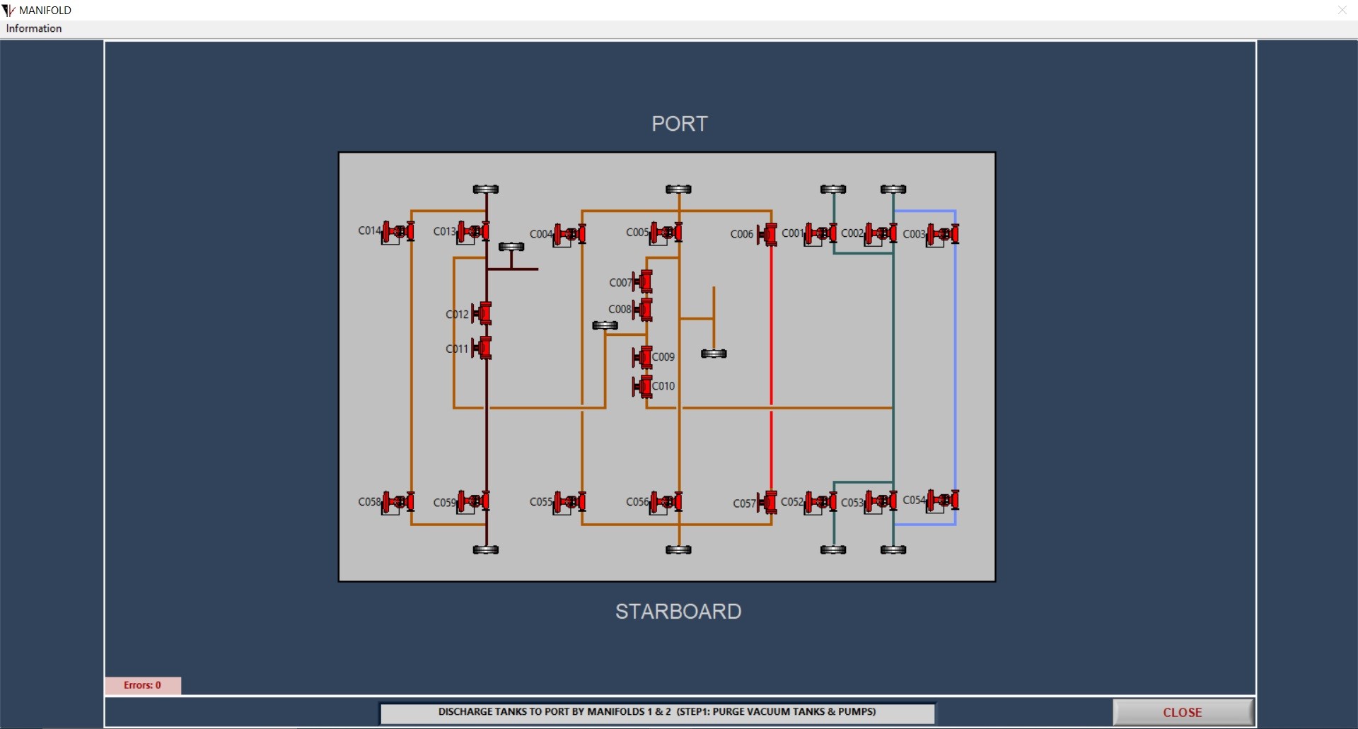 Model allows drilling of cargo load and discharge operations, including running-ups of training for cargo operations. Simulator also includes launch of Inert Gas System and control of isolated ballast system. Simulator includes possibility of training operations required before entering the dock, and operations needed to perform after leaving the dock before loading the cargo. There is also possibility of simulation ballast passage and passage with loaded cargo, with performing of correct sequences of all required actions for execution of the task.