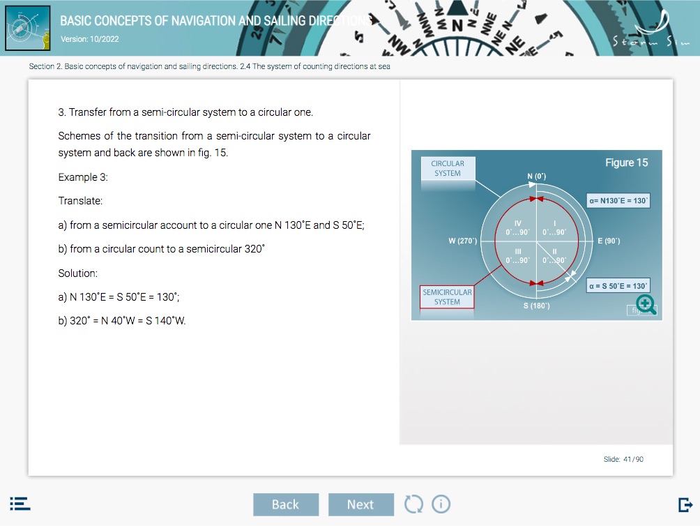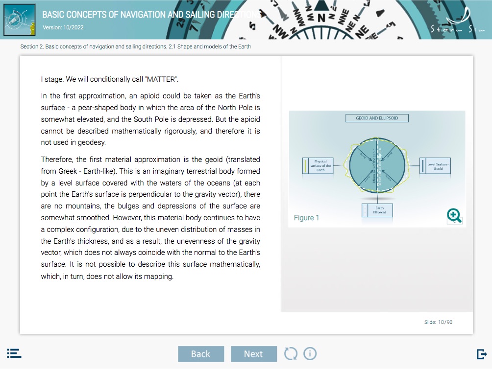 The e-learning module is designed for theoretical training of navigators at operational level in accordance with Chapter II of the STCW Convention in the part concerning of basic concepts of navigation.